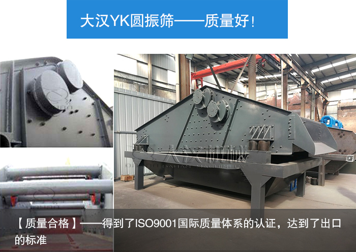 【質(zhì)量合格】——產(chǎn)品終都要回到使用這個因素上,所以只有質(zhì)量合格才能讓生產(chǎn)進行下去。大漢機械的YK圓振篩是嚴格按照國家生產(chǎn)標準生產(chǎn)的,經(jīng)久耐用,廣受好評,并且得到了ISO9001國際質(zhì)量體系的認證,達到了出口的標準。